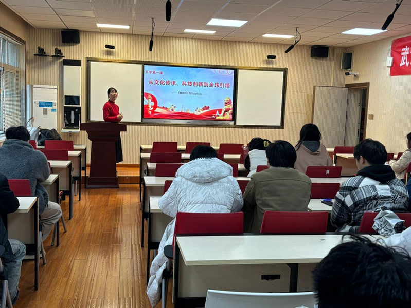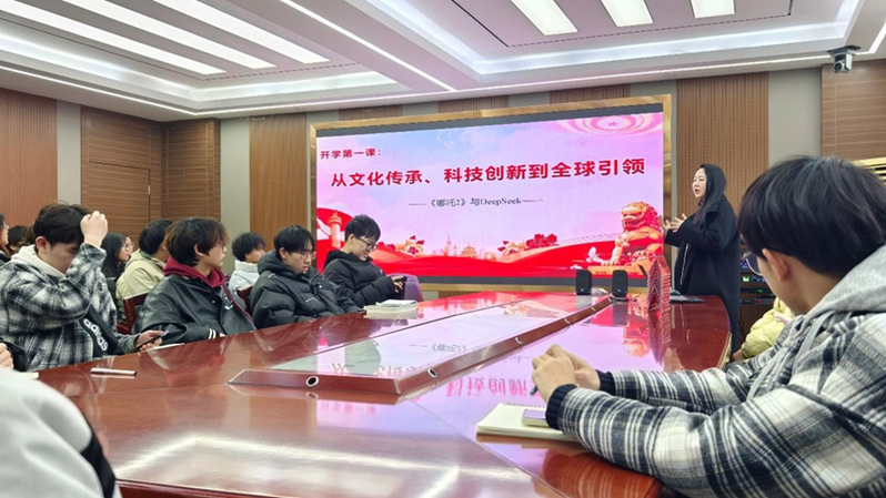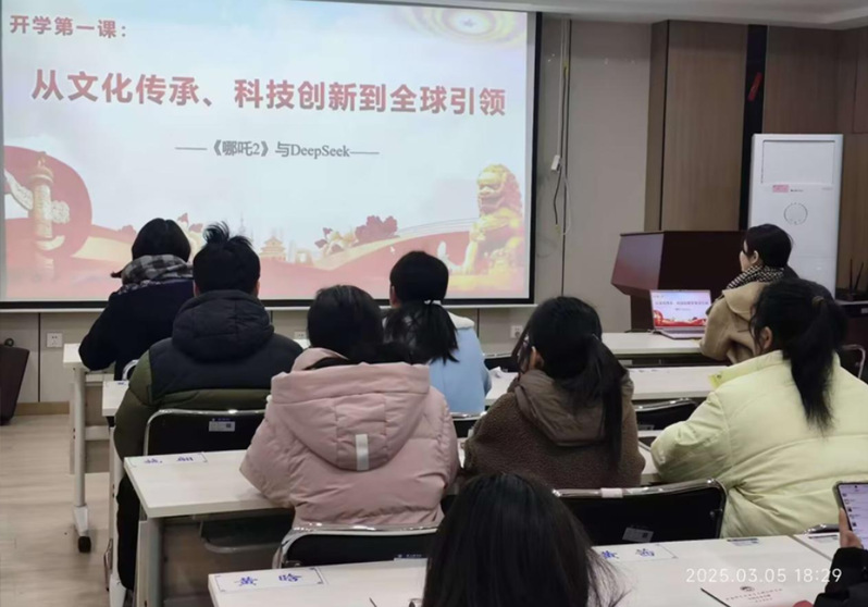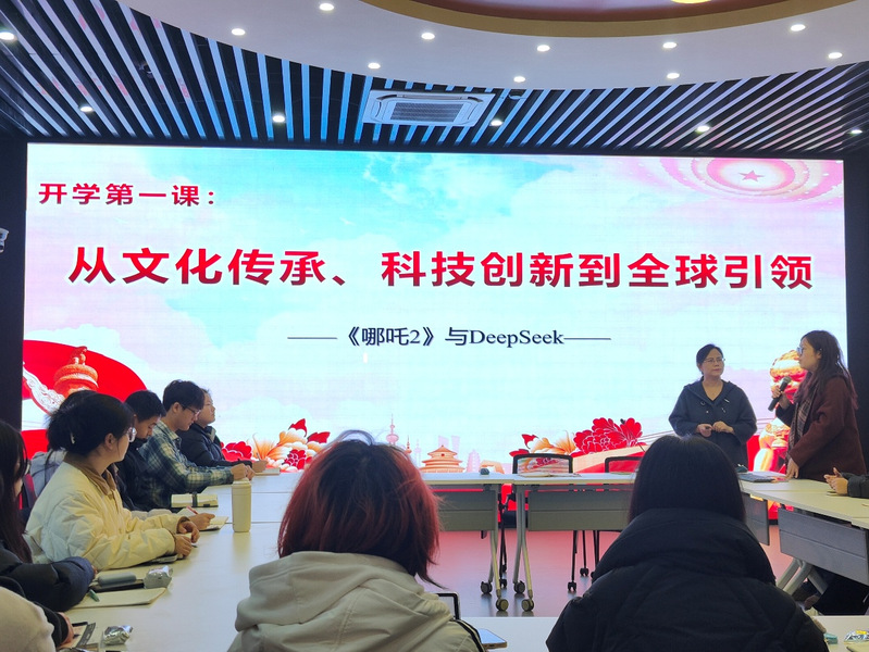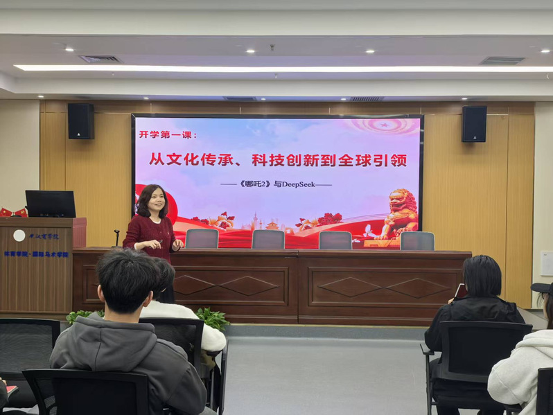 在国际教育学院,夏艳梅老师以全球引领为主要出发点,为同学们举出deepseek以惊人的下载量超越chatGPT的例子,从中国的科技突破为同学们树立“科技是引领创新的第一动力”的观点,又从文化传承和科技创新相互连接、共同切入,用《哪吒》的现象级爆火,提高了同学们的文化自信,展现了中国日益增长的文化影响力。
