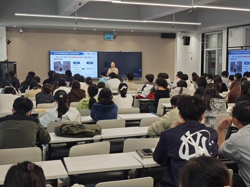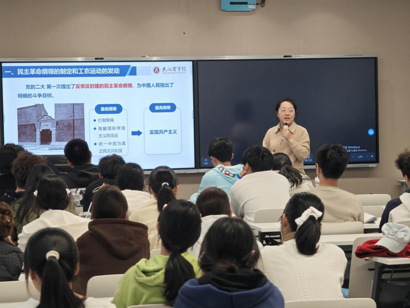 公开课在经典红色歌曲《工农兵联合起来》的激昂旋律中拉开帷幕。邱晓明紧扣“中国革命新局面”的历史进程,以一段1923年京汉铁路工人大罢工的原始影像导入课程,迅速将师生带入风云激荡的历史情境。讲授过程中,邱老师抛出“革命的起点究竟在哪里”“谁是革命新局面的真正推动者”等一系列问题,引导学生积极思考、踊跃发言。针对“统一战线政策的历史必然性”这一关键点,她借助时间轴清晰梳理了中共三大前后党内关于“是否联合国民党”的激烈争论等时局背景,来进行分析,深刻阐释“理论源于实践又指导实践”的道理。为鼓励学生深入学习历史、分析解读历史,邱老师组织学生诵读《中共三大宣言》原文,还推荐了《中国共产党统一战线史》《中国国民党第一次全国代表大会史料汇编》等权威文献。