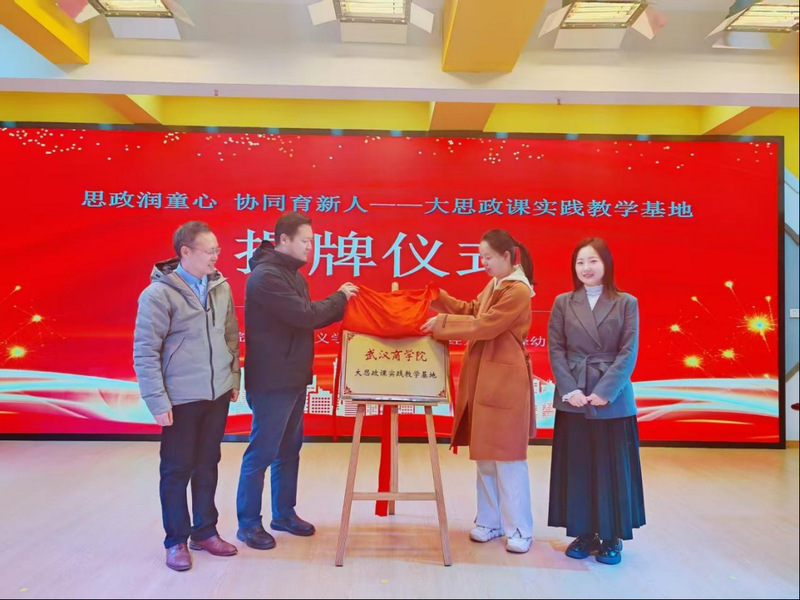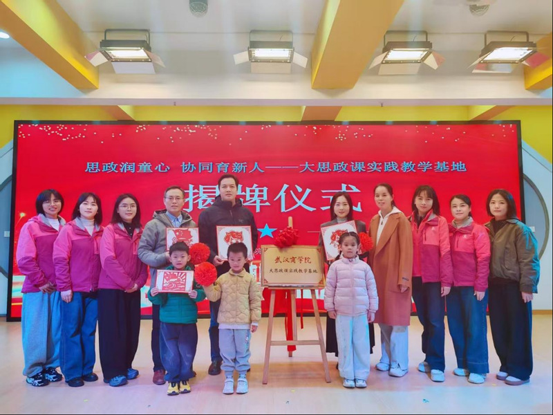 揭牌仪式现场,幼儿园的孩子们以纯真的方式表达了对合作的期盼——他们为商学院的老师们送上亲手制作的大红花与幼儿园吉祥物,这份质朴的互动不仅让思政教育的温度具象化,更彰显了“育心”教育的本质魅力。此次实践教学基地的建立,既是“大思政课”育人理念的创新实践,更是校地合作模式的突破性探索:它打破了不同学段教育的壁垒,将高校的理论优势与幼儿园的实践场景有机结合,让“大思政课”在学前阶段落地生根,使“立德树人”的根本任务从幼儿阶段便得到切实落实,为培养全面发展的社会主义建设者和接班人筑牢启蒙根基。